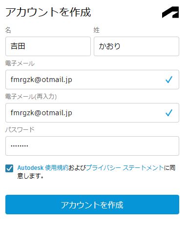 2.アカウントを作成して頂き最後に「アカウントを作成」をクリックしてください。最後にAutodeskのチェックボックスを忘れずにチェックしましょう。