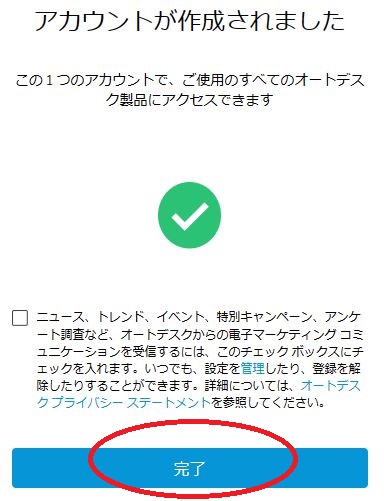 3.完了画面になります。他のautodesk製品をダウンロードする際はこの行程は次回からは端折れます。ニュースやトレンド、イベント情報などチェックボックスにチェックするとメールで届くようになります。必要ない方はスルーしてください。「完了」をクリック!