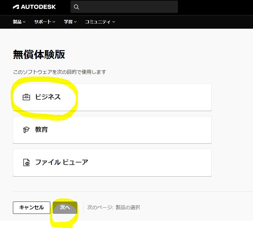3.ライセンスタイプを選択する。Auto CADを何に利用するか選択します。一般の方は「ビジネス」を選択します。ビジネスの方は30日体験版で無料お試しができますが学生やカリキュラムで利用する先生などは無料で利用し続けることができます。ご述説明します。AutoCADには、ビジネス(30日間無料)、学生・教員向け(無償)。
