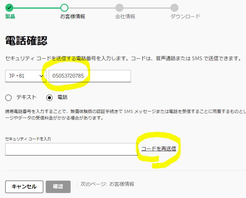 3.ここで電話番号を入力するとメッセージ(確認コード)が送られてくるのでその番号を入力するとダウンロードが可能となります。テキストの人を選択した人はテキストメッセージが送られて来るのでその番号を入力し「確認」をクリック。